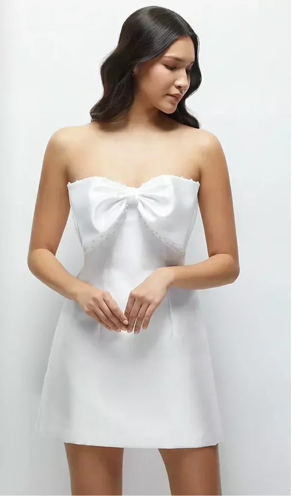 This stunning little white mini dress is perfect for any bride looking for a fun and flirty look. It features a gorgeous floral 3D Trellis Embroidery overlay that adds a romantic, elegant vibe. Underneath, there's a chic nude-hue boned corset-style bodice peeking through, giving it a modern edge. The playful, mini, fully-shirred circle skirt is just right for dancing the night away. And the delicate flower petal details on the spaghetti straps add a whimsical touch. This ultra-chic little white dress is your go-to for looking effortlessly trendy from rehearsal dinner to reception.
